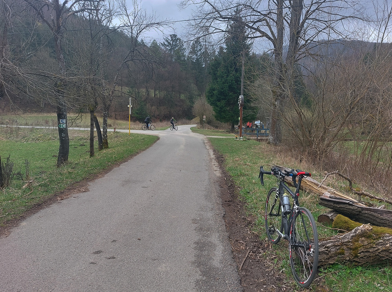 Hore som to otočil pri veľkonočne vyzdobenej zastávke autobusu a davaj nazad. Pôvodne som mal síce v pláne zokruhovať to cez Belušské Slatiny a znova cez Visolaje, ale pod tým strmým kilometrom, na odbočke do Hluchej doliny, vyzeral byť asfalt tiež prudko použiteľný, tak som radšej išiel opáčiť tam. A dobre som spravil – dolina tiež veľmi pekná, braliek a skaliek požehnane, pod kolesami hladko, stúpanie príjemné. Otočil som to tam, kde asfalt skončil – na spodnom okraji lúky, pod nejakou chatou, na skok od Zliechova:
