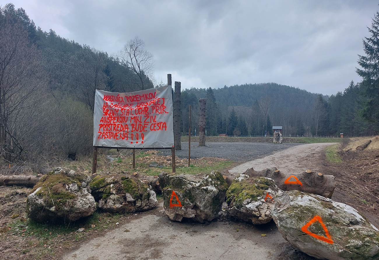 Rýchly fičák dole dolinou, nazad až na križovatku Riedka, a vrhol som sa doprava, vymeniac turistickú modrú za zelenú a cykloturistickú naopak, zelenú za modrú :-) Neďalekú odbočku cez Chmelisko do Pružiny som ignoroval, bol som zvedavý na dolinu Radotiná, smerom do Priedhoria. A parádna je, hladkosťou asfaltu, ale najmä krajinársky: znovu početné skalné steny a bralá nahusto rozhodené po svahoch, na dne početné záchyty prameňov pitnej vody. V doline už turistická pešia aj kolesová premávka hustla, cítil som sa v tej spoločnosti na cesťáku síce trochu cudzorodo, ale hrubšie gumy tu ozaj netreba. Jedinou výnimkou z miestnych pozitív tam aktuálne bola ukážka idiocie nejakého miestneho „zemepána“ – balvanmi zatarasená cesta. Podľa nápisu na transparente mu zrejme štát kafre do biznisu, tak prečo neuškodiť všetkým ostatným, že? Napríklad záchranárom či hasičom, keby potrebovali prejsť (foto v galérii).