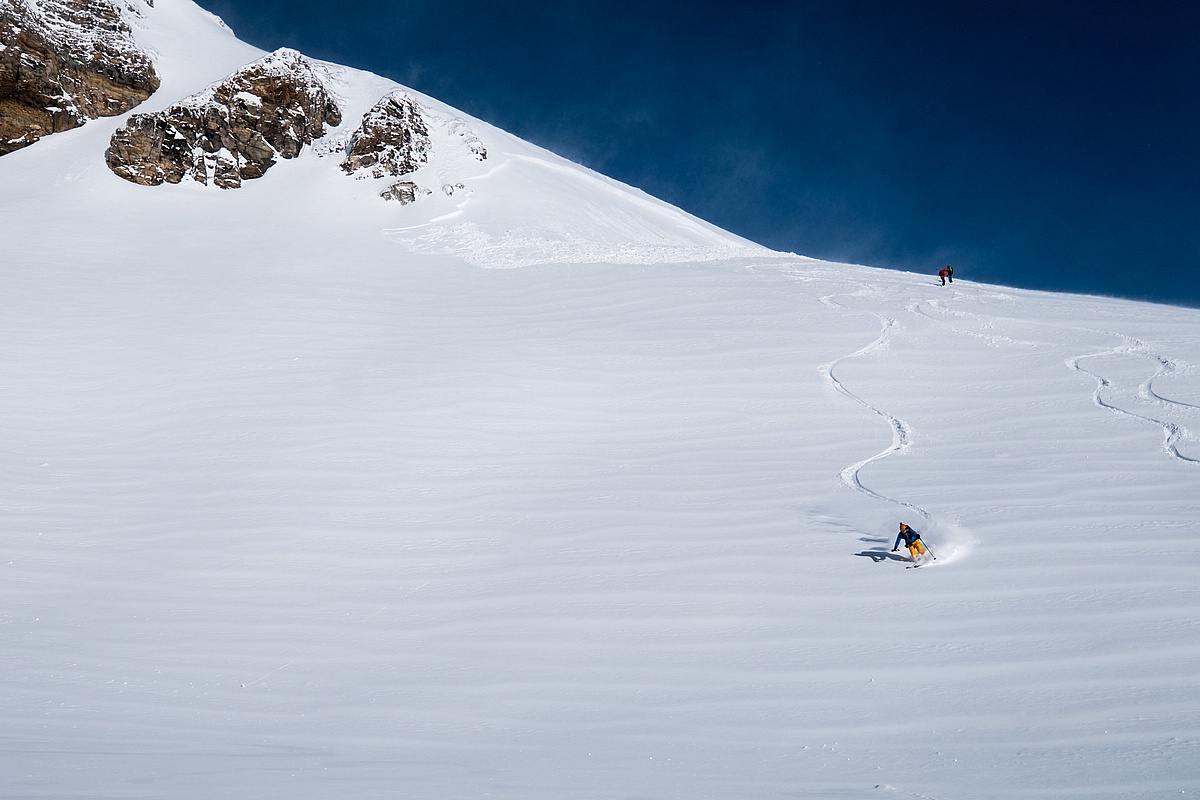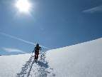Na Silberpfennigu sme dnes prvé družstvo. Fúka silný nárazový vietor a ja z výstupu na neznámy a pekný kopec nemám príliš veľkú radosť. Predbieha nás raketové družstvo asi siedmich borcov, ktorí miera rovnako na vrchol. Som rád, že nie sme na kopci sami a rozmýšlam, čo nás bude čakať pri zjazde. Tak ako včera pod hrebeňom haršajzne a posledných pár desiatok výškových metrov na vršok v traverze a burácajúcom vetre. Prichádzame ku krížu, vietor sa prekvapivo utišuje. Kochám sa výhľadmi do Raurisu na Sonnblick a Hocharn. Za nimi trčí aj Glockner. Lyžuje sa priamo z vrcholu a Jarouš zvestuje, že skupinka pred nami lyžovala dole Angertalom, rozumej inak ako výstupovou stopou. Prichádzajúce informácie ma napĺňajú optimizmom a začínam byť zdravo zvedavý, čo nás čaká. Sneh pod vrchom je úfukaný do strúng a vetrom vyšľahaných návejov. Platí, tak ako včera, že čím nižšie, tým lepší sneh. Takže sme zase raz vytešení v prašane a mierime pre mňa do neznámeho terénu. Z rozľahlej pláne prechádzame do strmého zavretého žľabu plného prašanu. Vôbec nevadí, že už je rozlyžovaný. Doryjeme ho statočne. Mierna lúka, hustý les, slalom pomedzi polom popri potoku, všade je plno čerstvého snehu. Nechávame sa viesť stopou našich predlyžiarov, ktorá nás privádza na zjazdovku. Po chvíli sme pri aute. 1600 výškových máme v nohách a plní dojmov mením plánované kúpele za posedenie s kamošmi pri víne.