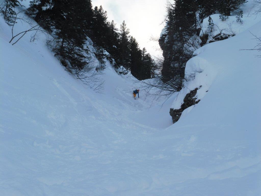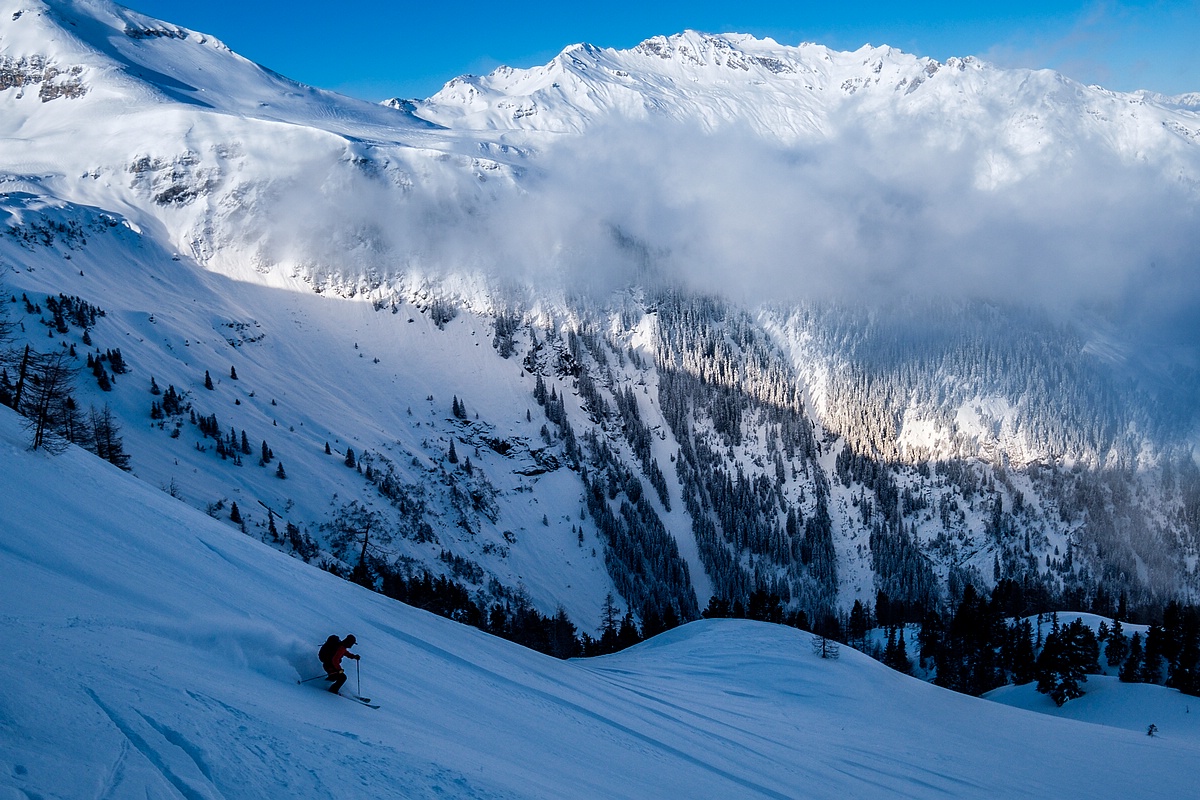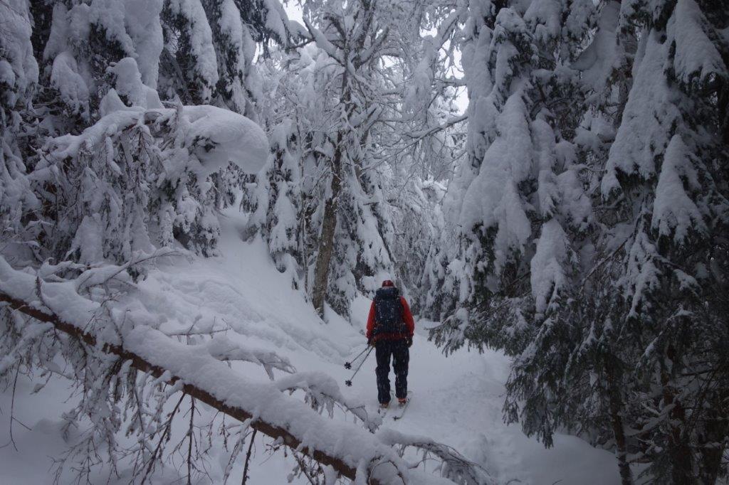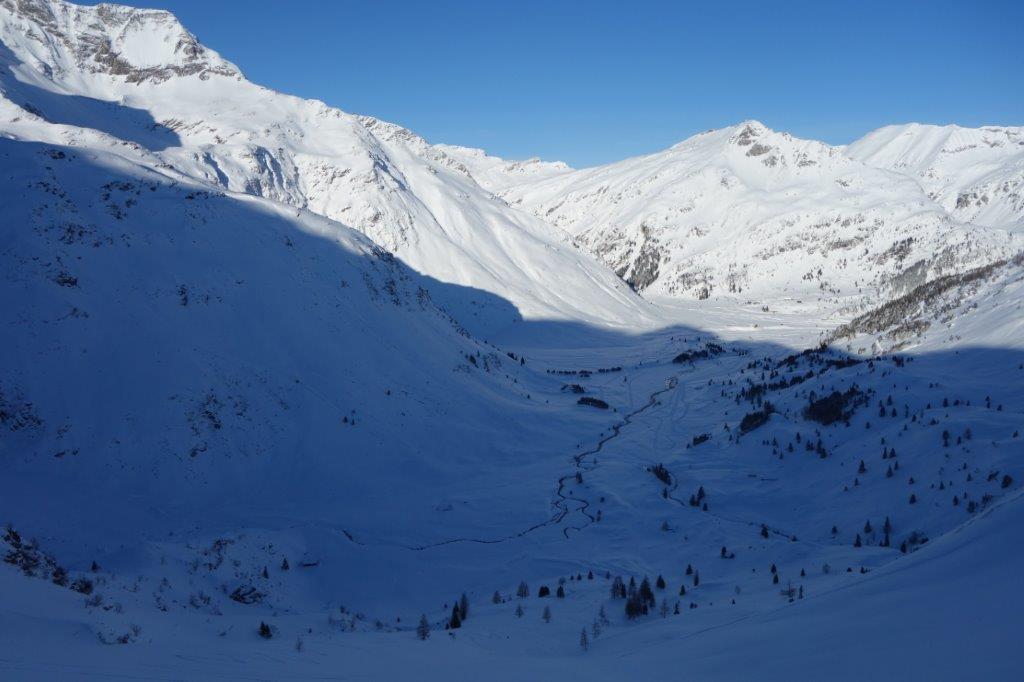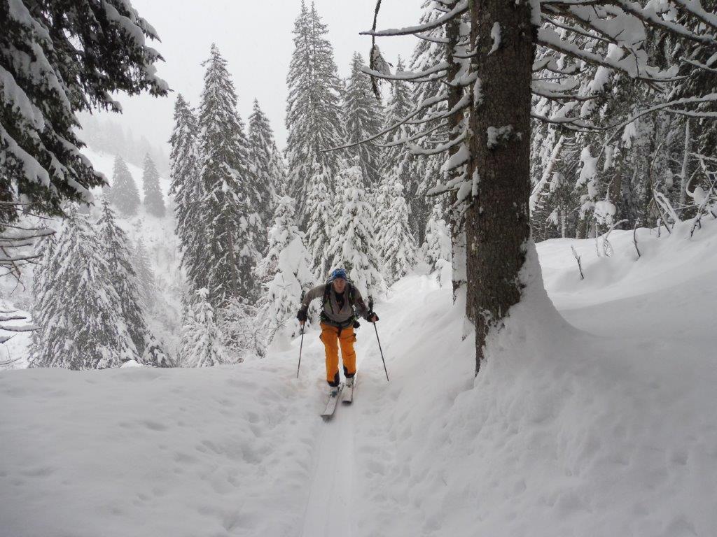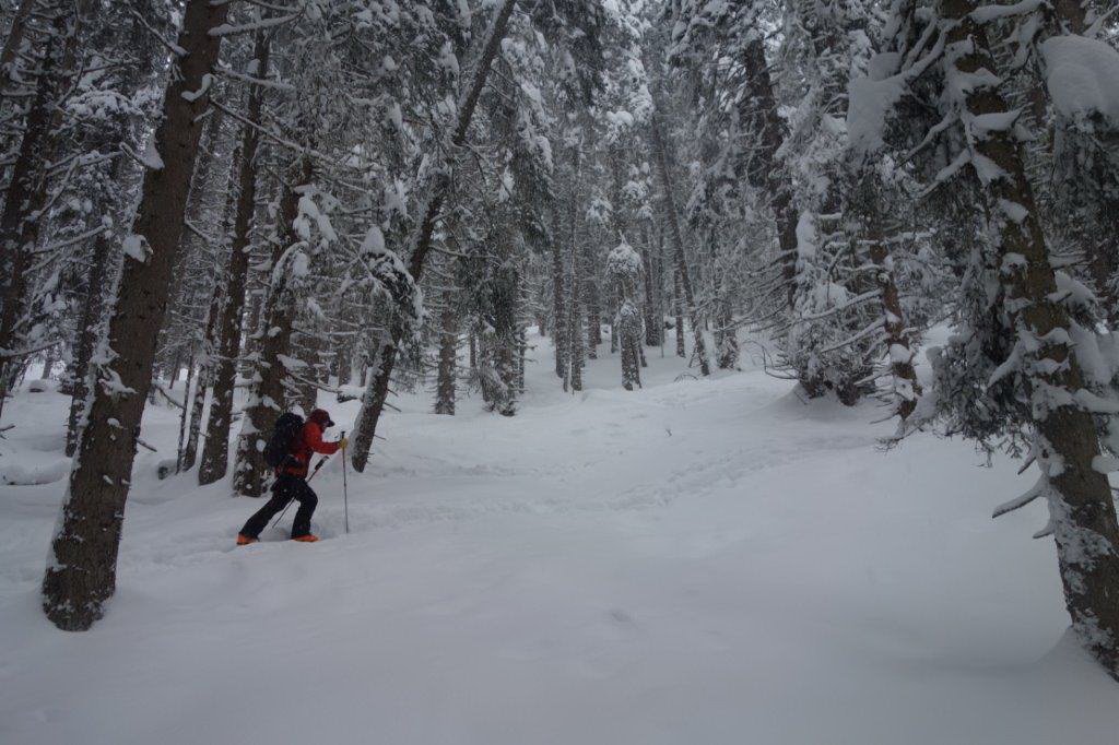 Piatková predpoveď sľubuje vietor a sneženie preto nie je priestor na žiadne veľkolepé túry. Jarouš vyberá miestnu klasiku Kalkbretterkopf v údolí Angertal. Začíname pri údolnej stanici lanovky a krátko na to začneme naberať výšku strmou stopou lesom. Zimná rozprávka. Stromy olepené množstvom snehu, takmer bezvetrie a čerstvo prešliapaná stopa. Tesne pod Gadauner almami vychádzame z lesa. Viditeľnosť biedna, vietor silnie a sneží. Našinec neznalý pomerov by to asi mal už zabaliť, Jarouš však vie ako bezpečne ďalej, tak pokračujeme smerom za našim dnešným cieľom. Túra, ktorá je za dobrých podmienok veľmi populárna a hostí desiatky skialpinistov, dnes nie je taká vychytená. V doline stretávame možno tri dvojice a na vrchol idú za nami len dvaja odvážlivci. Pod vrcholovým hrebeňom nasadíme haršajzne, ostrý hrebienok na pešo a k vrcholu zase na lyžiach. Nezdržujeme sa. Zhodiť pásy, dotiahnuť lyžiarky a ide sa dole. Lyžujeme vrcholových žliabkom ufúkaným snehom. Asi po 100 výškových metroch to však pride. Prašan, zo začiatku trošku zmenený vetrom, čím nižšie, tým lepšie podmienky. Skutočná odmena. Vietor nám už vôbec nevadí a užívam si prvé oblúky tejto zimy a hneď v takomto perfektnom snehu. Dole potokom a kúsok po zjazdovke. Prvých 1200 výškových metrov tejto zimy nemalo chybu napriek tomu, že bolo zamračené so snežením.