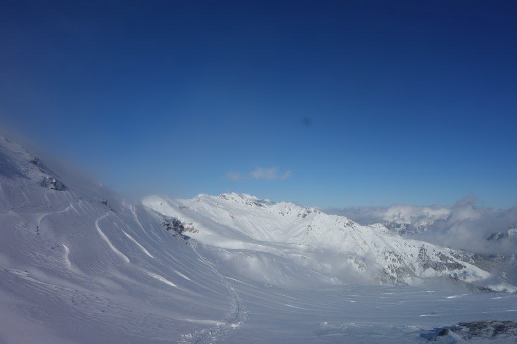 Nečudo, že boli moje očakávania na sobotu vysoké. Relatívne lepšia predpoveď s dobrou viditeľnosťou, no silnejúcim vetrom a pretrvávajúcou lavínovou trojkou si žiadala skúseného lokálneho borca. Jarouš teda vyberá Silberpfennig. Túra na kopec oproti Kalbretterkopfu s možnosťou lyžovania inou trasou Angertalom. Pridáva sa k nám parťák z Budejovíc Kuba, a tak v trojici vyrážame rovnakým smerom ako v piatok. Hneď pri ceste autom vidíme, že dnes budeme mať zaujímavé výhľady na kopce v okolí. Takže mi rovnaká výstupová trasa pod Kalbretterkopf vôbec nevadí. Míňame almy a vietor, tak ako včera, naberá na sile. Prichádzame na roveň pod Kalkbretterkopfom, kde nás čaká krátky zjazd (asi 150 výškových metrov) a mali by sme opäť nalepiť pásy v ústrety Silberpfennigu. Fotím, natáčam a kochám sa. Chalani už odjazdili, ja už nasadzujem prilbu a chystám sa na to isté. Terénou hranou a prevejom zrazu prelyžujú dvaja borci, narežú asi 30 cm hrubý a 10 m široký odtrh. Kokoti. Priamo na mňa, tiahlo airbagu mám už v ruke. Naštastie nános nie je vysoký a zastane pár metrov predo mnou a ja nemusím potiahnuť. Chlapčiská prejdú okolo akoby nič a ja ostávam v nemom úžase. Beriem sa preč a lyžujem za chalanmi do bezpečia. Plný myšlienok, ako to mohlo dopadnúť.