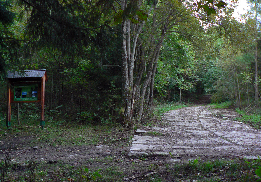 Do Kremnice som dovrčal motorákom, tak som si to trocha „skrátil“, nezačal som až zdola z námestia. Vrátil som sa len trochu nazad popri koľajniciach (smerom na sever) a bez problémov som trafil žltú, ktorá ich križuje. Ďalej to už také jednoznačné nebolo, hneď nad železnicou je viacero odbočiek a značky buď staré a neviditeľné, alebo žiadne. Až po spojenie s modrou značkou na Trojici to chce trochu sústredenia, ale žiadna tragédia. Smer je jasný. Na začiatok sa treba držať značiek náučného chodníka. V úvodnom strmšom stúpaní lesom sú aj tri náučné tabule.