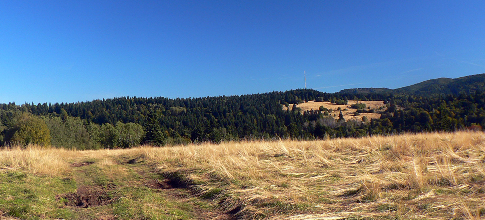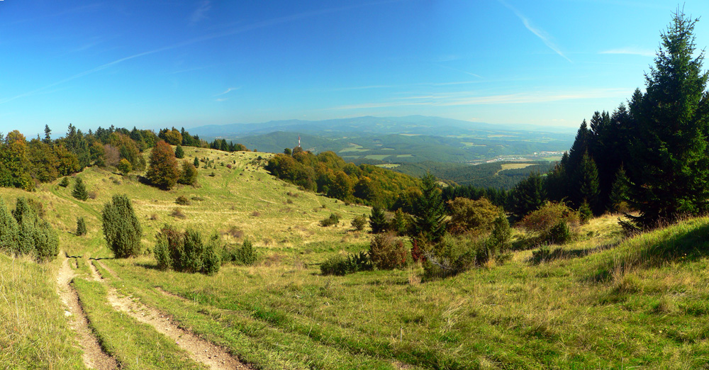 Pod Košiarmi ešte kratučká zachádzka k pamätníku sovietskych letcov a to už sa pomaly vynáram z lesa na lúky a pasienky, smerujem do Horných Pršian. Výhľady zas pribúdajú, najlepší je od vysielača nad dedinou. Je tam aj prístrešok, príjemné by bolo posedieť, nebyť toho elektrického bzukotu.