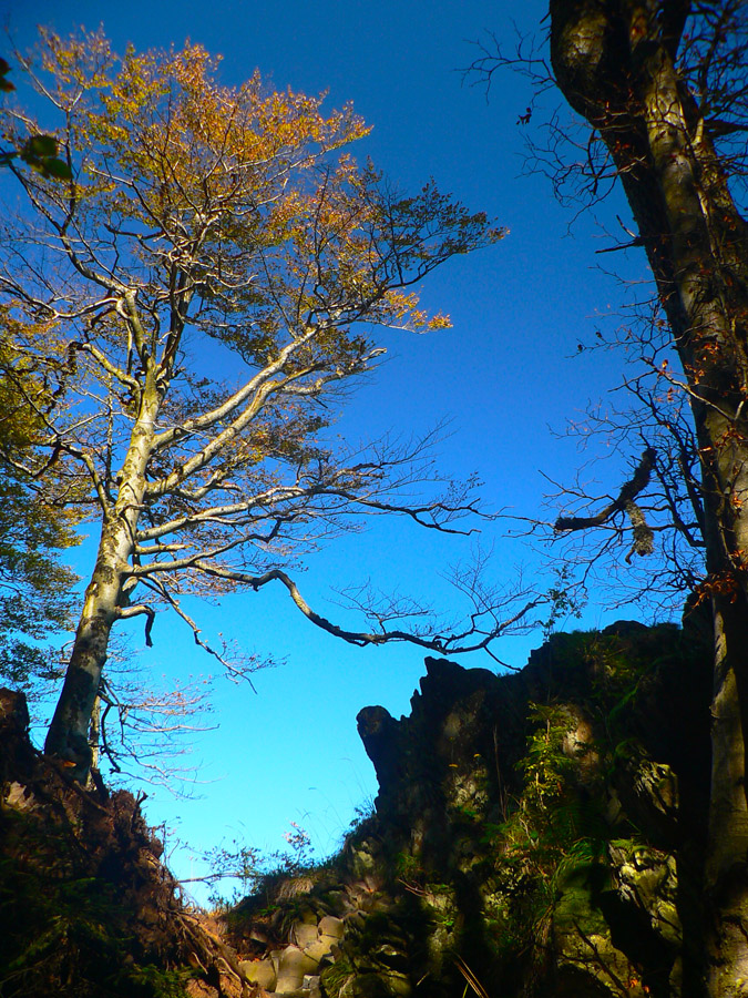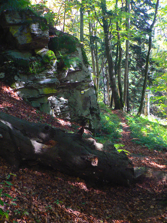 Preklápam sa na bystrickú stranu a dole kopcom pokračujem zas po žltej. Už to väčšinou nie je zvážnica, ale o dosť príjemnejší (aj keď strmší) lesný chodník. Povinná zastávka: vyhliadka Horná skala, krásna panoráma Malachovskej doliny s vysielačom naľavo, Krížnou a spol. vpredu a Bystricou napravo.