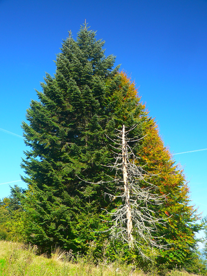 Na Hostinci je veselo, veď je nedeľa - a pekná, septembrová. Hádam to babie leto konečne prišlo. Dnu nejdem, len si dám trocha vody „U raneného bojovníka“ a posúvam sa ďalej. Do sedla Tri kríže je to len štvrťhodinka, ale radšej idem obchádzkou cez Velestúr, ako by som sa mal trepať po zvážnici. Tam nie sú ani výhľady, spod Velestúra aspoň jeden vďaka rúbanisku - Skalka je z neho ako na dlani.