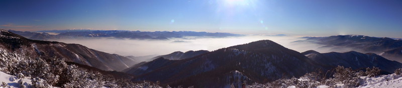 Dolu mrazivá hmla, teplota hlboko pod -10, no fuj! Už nad Kľačanmi ale presvitá modrá, takže žiadna strašná inverzia, cez deň aj do kotliny slnko nakukne. Stúpanie na chatu pod Kľačianskou Magurou je pekne na juh a pekne strmé, navyše bez vetra, veď čo by som chcel pri inverzii? Zhadzujem jednu vrstvu po druhej až po tričko. Na pásoch by sa to dalo s trochou opatrnosti možno od Dlhej lúky, smerom dolu ale isto nie. Pre pešiaka je však chodník ideálny, predupaná diaľnica až do sedla pod Suchým, zmrznutý sneh výborne drží, nepodklzuje. Toto bude platiť na väčšine dnešnej trasy – kráča sa pohodlnejšie ako v lete. Aj ľudí je tu skoro ako v lete.