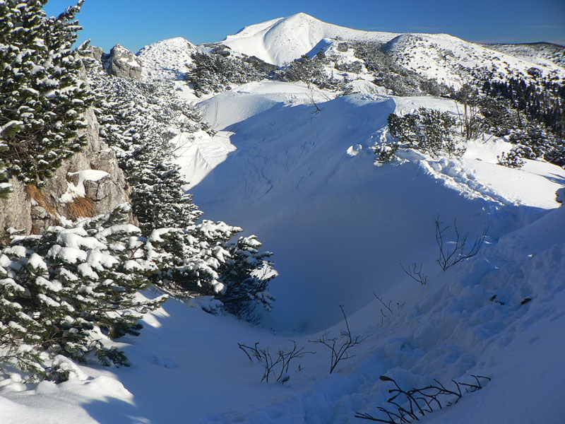 Pod Malým Kriváňom dvaja nadšenci (lyže a snowboard) skúšajú malú muldu pri chodníku, ale tie zvuky spod hrán patria skôr k hokeju... Na pásy je tu na chodníku všade primálo snehu, v muldách zas priveľa ľadu. S úžasom o to väčším preto sledujem pomerne čerstvé stopy od pásov pod Veľkým Kriváňom, ich autor sa musel k smrti „ukľučkovať“ pomedzi šutre. Že toto niekoho baví... Z vrcholu do Snilovského sedla schádza zopár ľudí, sklamane nesú krikľavo farebné klzáky, skúšajú to aspoň na kúsku, ale na takomto zmrznutom podklade sa ani nešmýka! No mne to vôôôôbec nevadí, len by mohlo trochu menej duť, aby som bol po troch fotkách ešte schopný stlačiť spúšť. No nestlačím! Takže rýchlo preč do závetria, smer Snilovské sedlo. Tam je tradične husto, ľudia sa hemžia všetkými smermi, najviac ich je v traverze k chate pod Chlebom. To je teraz asi jediná (pre sklznice) bezpečná cesta v oboch smeroch. Cestou na chatu vidím, že aj východná krivánska mulda je husto počmáraná lyžami – je tam v závetrí predsa aspoň trochu prašanu.