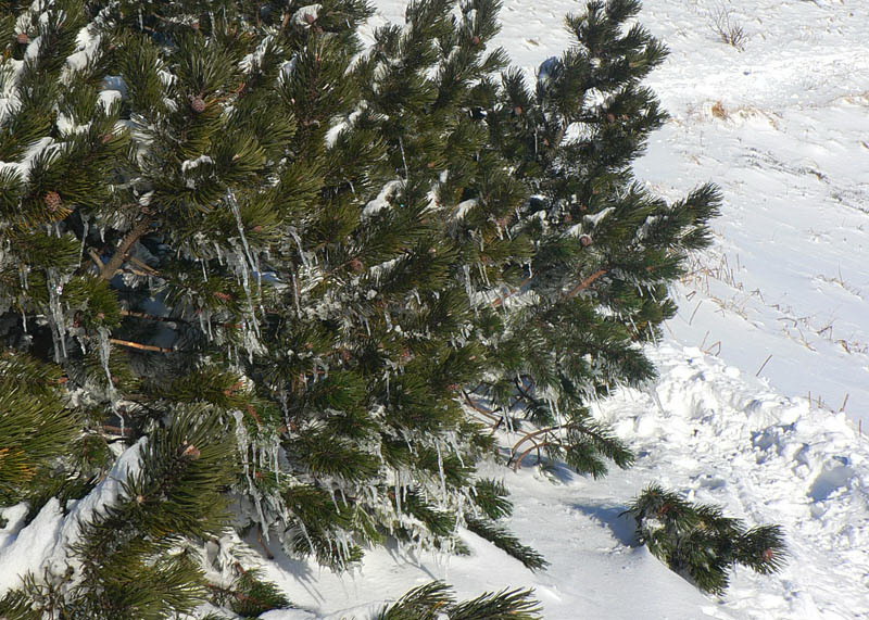 Preplietanie pomedzi bralá a zaviatu kosovku na Bielych skalách a Stratenci je príjemnejšie ako v lete, varovaním sú len hlboké diery do snehu medzi konáre, ktoré tu zanechal niekto ťažší. Ako chodník preskakuje z južného záveterného svahu na severný, striedavo sa prehrievam a mrznem. Od Priehybu sa na chodníku väčšinou striedajú malé naviate plochy s platňami drsného ľadu, ktorý ale tiež dobre drží a všetko to príjemne vŕzga pod nohami.