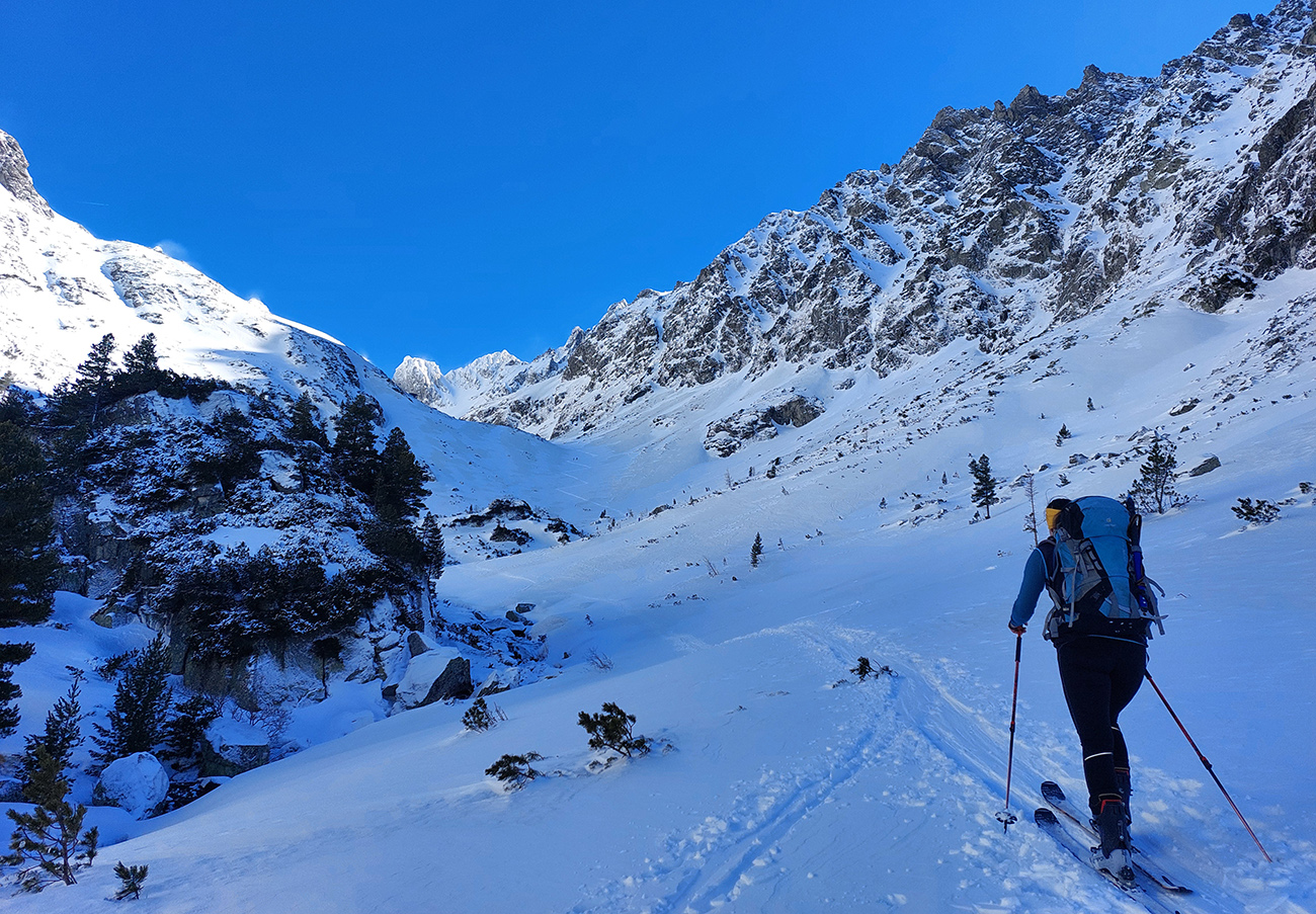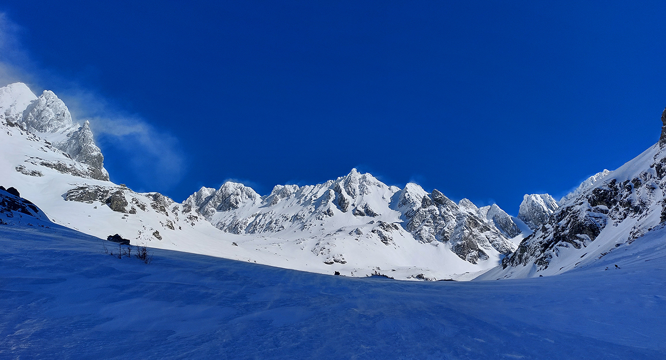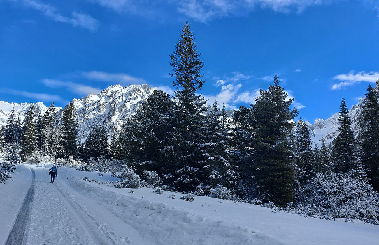 Na hrane pod Zlomiskovou vežou akoby sme vošli do sopečnej krajiny – tak sa z vrcholkov naokolo „dymilo“. To tam víchor víril snehy a posielal ich na východ. V doline ale pohoda a keď, tak len jemné potlačenie do chrbta. Nad hlavami azúro neskutočné, no pohľad vpred, do Železnej brány, ukazoval v nej poriadnu metelicu.