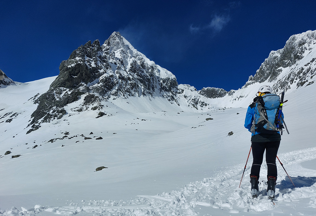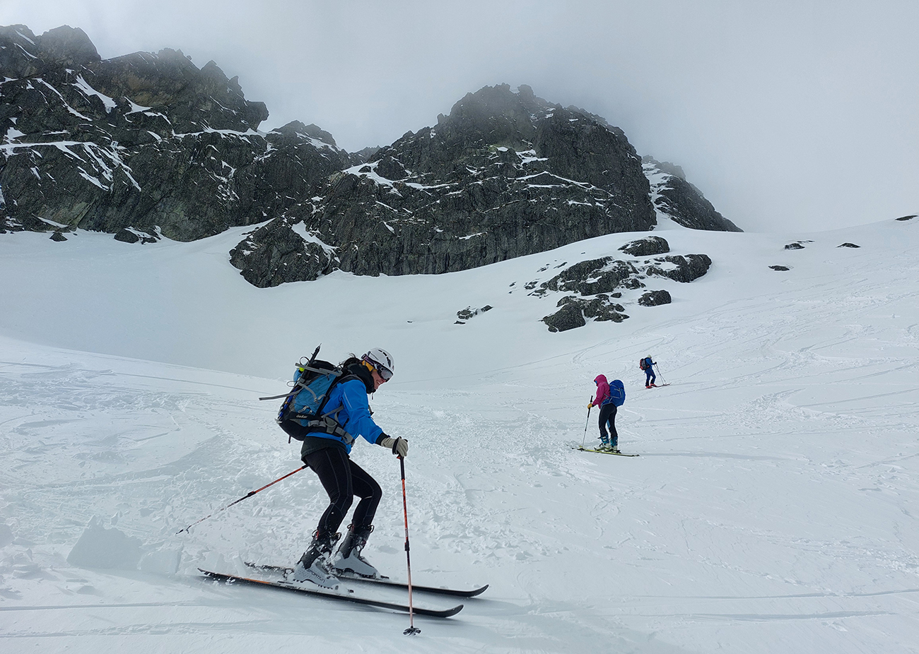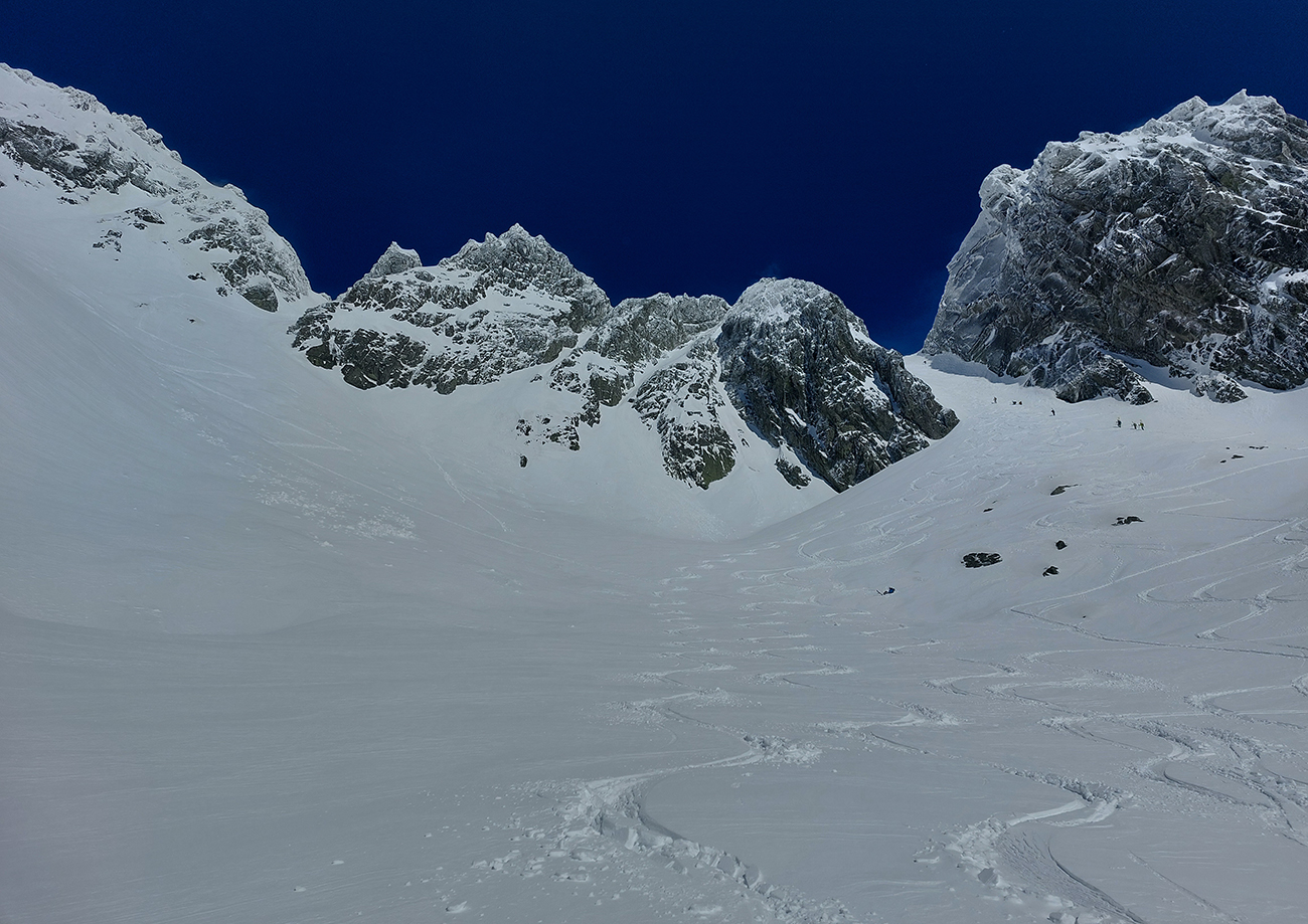 Tak nazad: lyžba nič moc, kombinácia vlhčiny a ľadovej hrčatiny. Nižšie lepšie, homogénnejšie. Zlákala nás čerstvá stopa do Strážneho sedla, našťastie cestou hore moc nepieklo a vietor chladil. Ďakujeme predjazdcom, ktorí to potiahli do Západnej Železnej brány a predjazdkyniam smerom do Strážneho sedla. Ony potom valili nazad dole do Železnej kotliny, my na opačnú stranu, do Kotliny pod Dračím sedlom. Miestami aj príjemná lyžovačka to bola!