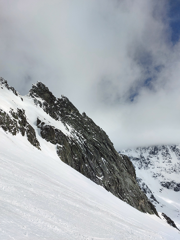 Aj tak bolo: schodíky sme síce už mali, ale hore boli víchrom zaviate, ani mačky sa do toho ľadu miestami moc nechceli zasekávať. Posledné metre pekne po špičkách. Hore prevej, za ním neviditeľno, ako tam nárazy uragánu vírili sneh. V ich prestávkach sa zdola škeril čerstvo načechraný a poriadne veľký vankúš – no neodvážil by som sa tam nalyžovať.