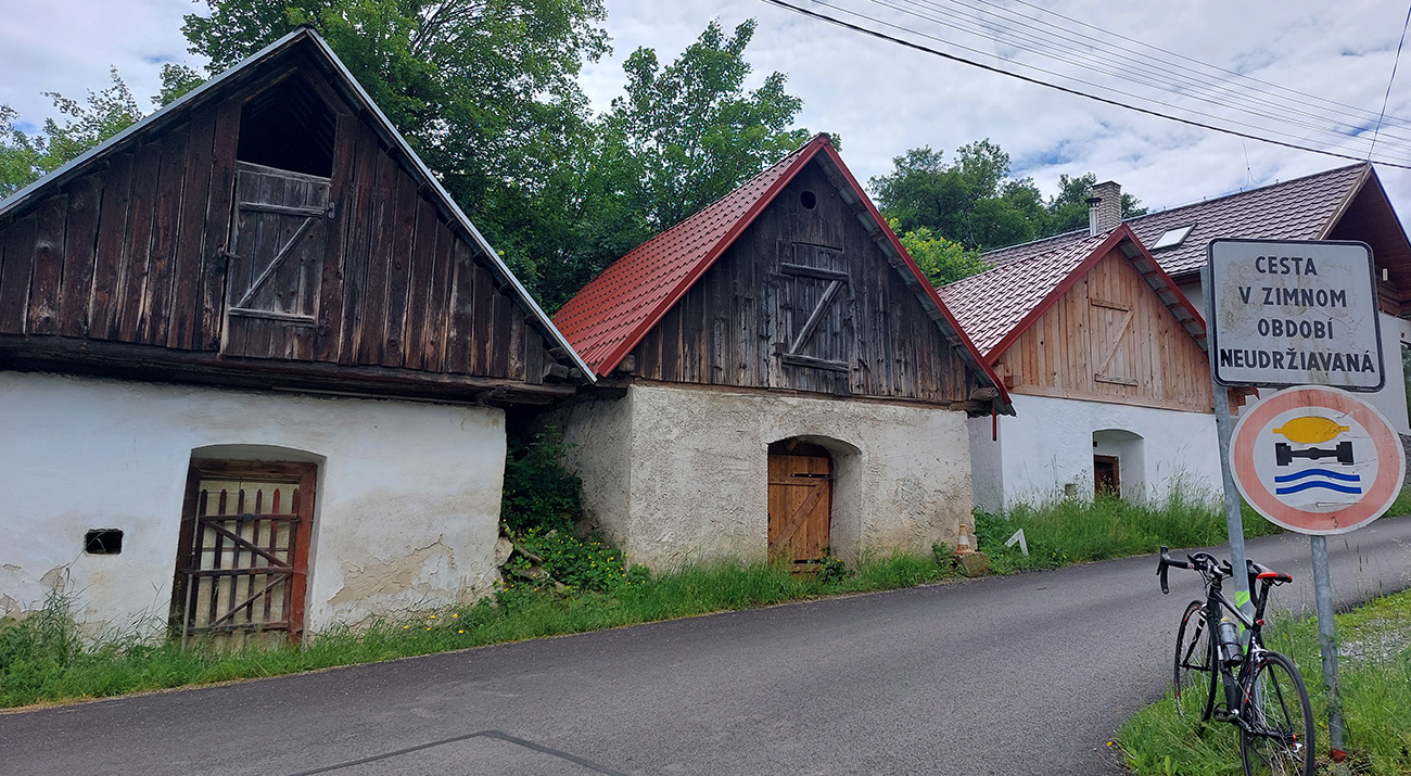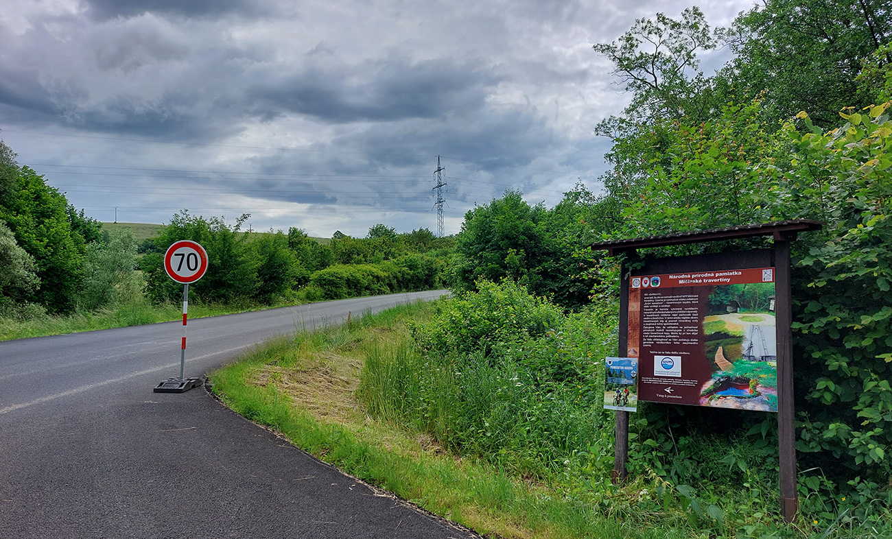 Ďalší kopec na trase je pre zmenu najprudší – ale som sa k nemu musel najskôr dostať od Hrona hore dolinou do Môlče. Roky to bola najrozbitejšia cesta v okolí, ale aj tu je už chvalabohu asfalt ako detská ritka. A stúpanie také mierne, na rozjazd. No z námestia to bez výstrahy začne – popri romanticky sa tváriacich ľudových sýpkach prechádzajúca cesta sa zrazu zúži a poriadne „postaví na zadné“. Už len tá značka na jej začiatku niečo napovedá: