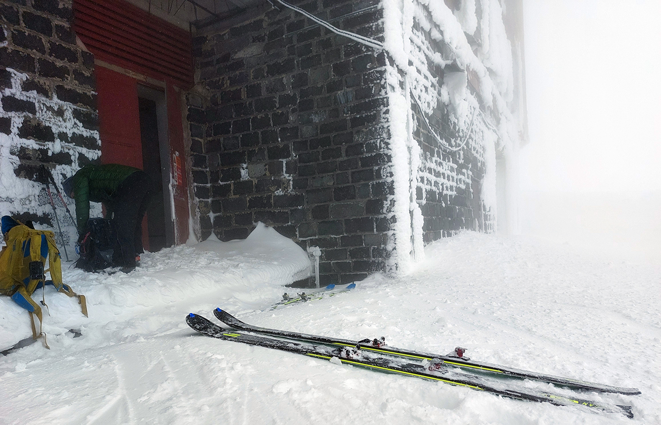 Počasie však čoraz horšie – jz víchor sa dvíhal. Našťastie ešte cestou hore tlačil do chrbta, viditeľnosť však nulová, difúzna. Aspoň, že na nás snežiť prestalo, v tom predpoveď vyšla. Iba dáke ihličky vzduchom lietali. Takže hore pekne po tyčiach a rýchlo do závetria za východnú stenu vysielača, pred vchody ku trafákom – jeden bol dokonca otvorený (či vylomený?) a interiér za ním zjavne už mnohým poslúžil.