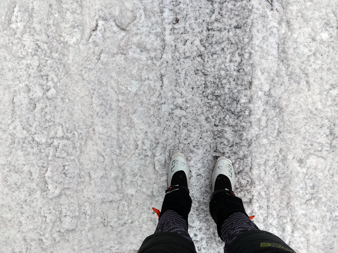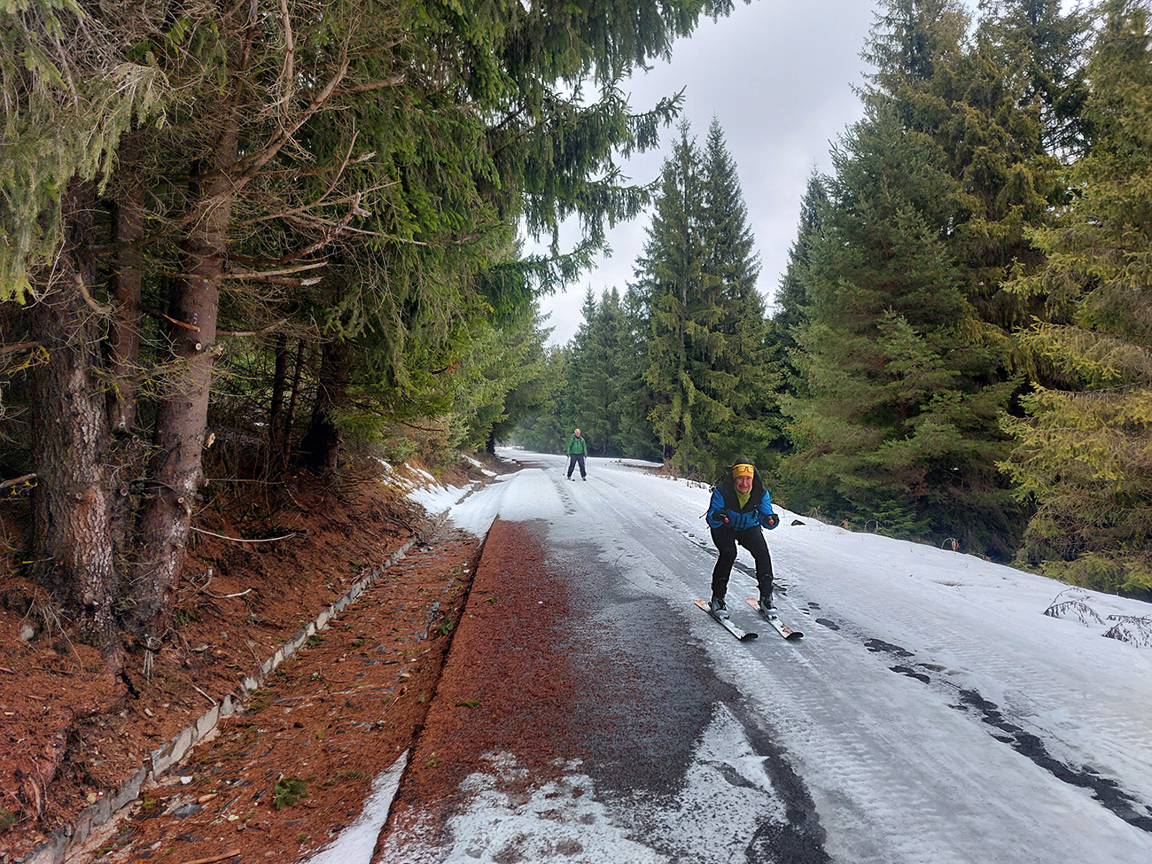 Cesta uvalcovaná, rovná, pod popraškom mokro ľadová – čím nižšie, tým mokrejšia. Na otvorených úsekoch miestami aj koľaje až na asfalt. Vyzuli sme niekde medzi spodkom kalvárie a odbočkou modrej značky (asi 960 m).