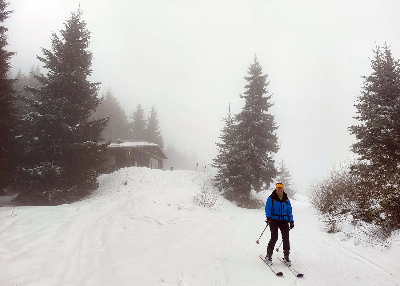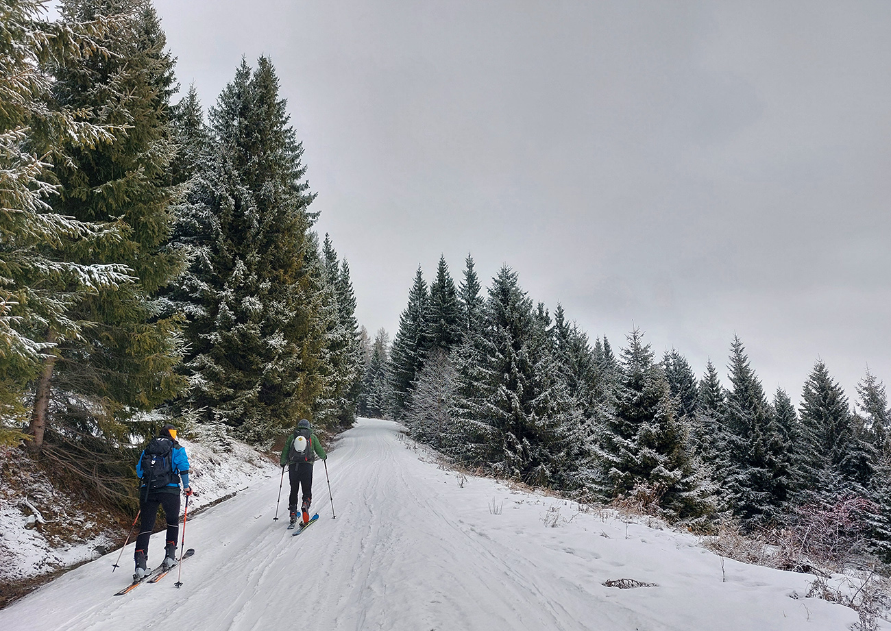 Hneď na úvod – nedá sa od parkoviska! Ale má snežiť, po ceste to pôjde. Lebo na valentínsku sobotu bolo hlásených málo oblakov, žiadny vietor (ani hore!) a teplota tak do -6. Nemohol som odolať ponuke na odvoz, sám to mám z domu priďaleko. Do soboty rána síce na predpovedi pribudli oblaky, inak ale nič, tak v aute všeobecný optimizmus. Ten sa ale cestou dooooosť rozplýval. No už nebolo cesty nazad. Tak v Šumiac – city sme oferovali tri Eurá parkovného a našli sme hádam posledné miesto pod rampou. Tí, čo potom zaparkovali nad rampou, doooosť draho obišli. Keď sa poobede dole vrátili, už ich čakali „štátni výbercovia“. Vystupovali sme do poriadne hustého sneženia, ktoré hneď zakrylo zvyšky ľadu na ceste. Niektorí optimisti skákali do lyží už pri autách - hore cestou sa dalo, len potom vytopený úsek, bolo treba pár stoviek metrov nad rampou preniesť. My sme poctivo vyniesli na batohoch po turistickom chodníku až na serpentínu cesty na Skaličke (1100 m). O poschodie vyššie na Grúniku (1300 m) sme sa už odvážili aj mimo cestu. Odtiaľ sa už podklad rýchlo zlepšoval – snehu pribúdalo a práve potiaľ by som si to trúfol zlyžovať aj mimo cesty.