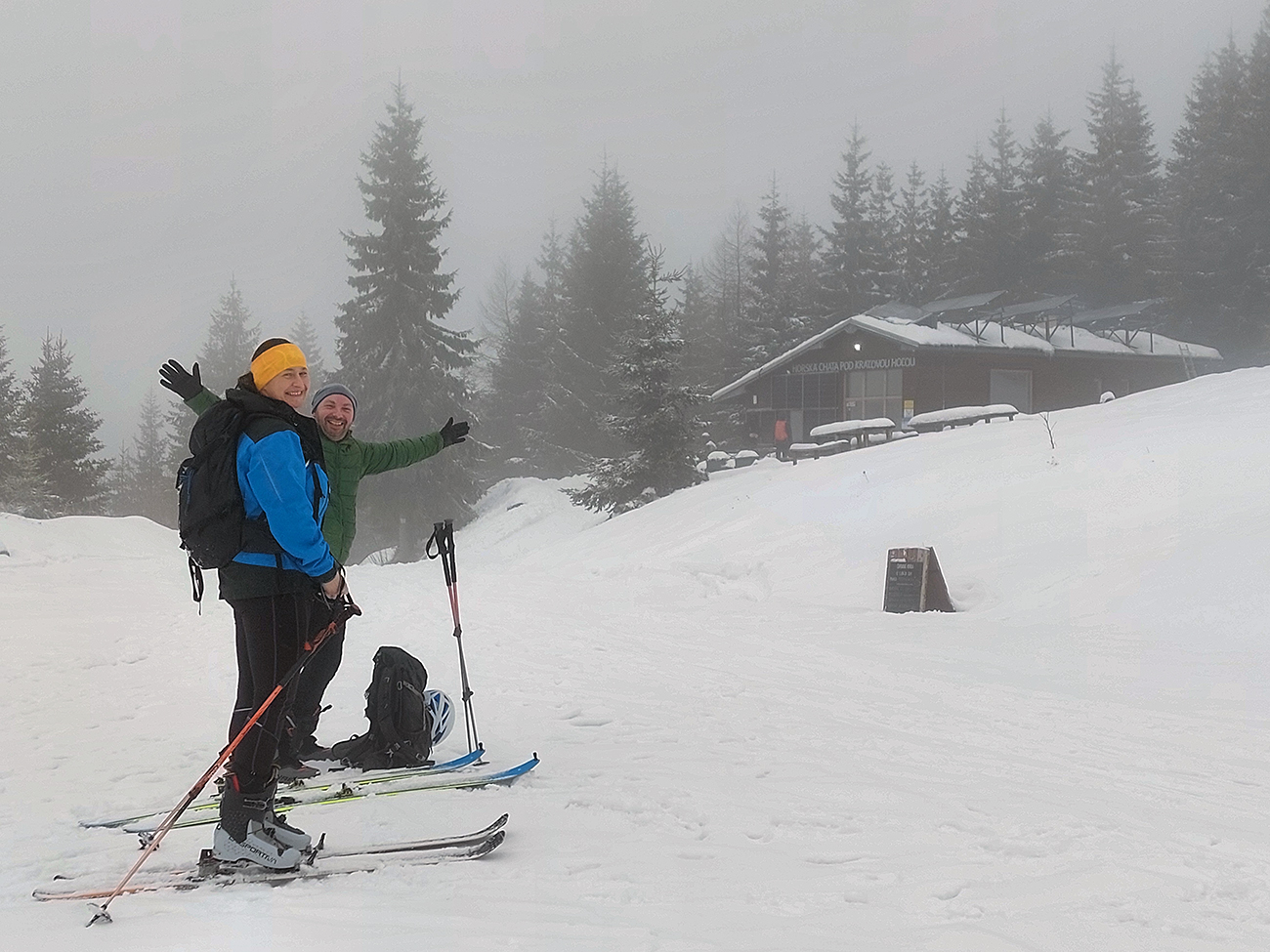 Až nižšie, po vjazde medzi kríky okolo cesty, sme niečo pod nohy videli. Veľa ľudí to tam, na hranici neviditeľnosti, aj otáčalo. Lenže aj tam to už vŕzgalo pod nohami a pri chate sneh už navlhnutý. Posedeli sme pri polievke, dali ešte jeden výšľapík po tú hranicu krovín - a už len dole. Pekne po ceste.