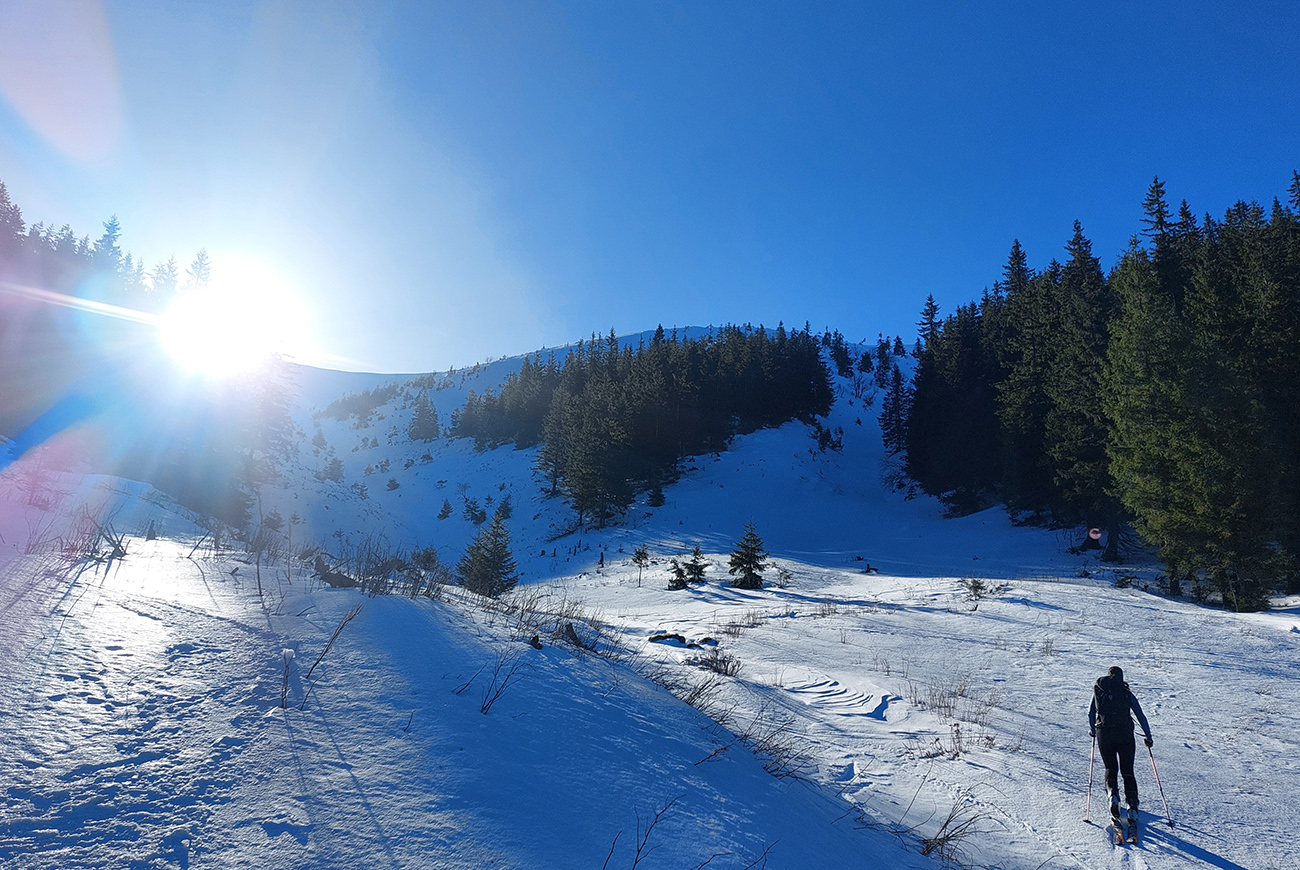 Krásna „jarná“ sobota, posledný deň februára. V kotlinách a dolinách ráno primrznutô a snehu už dávno „nula celá nič“, to isté v tej hlbokej cestou z Partizánskej Ľupče na Magurku. Len medzi chalupami na Magurke trošku ľadu, ale dalo sa v pohode. Na kopcoch nad Litovskou Lúžnou už nad nulou a obloha čistomodrá. Okolo ôsmej sme parkovali v pohode kúsok pod chatou Magurka, vyniesli lyže na chrbtoch kúsok nad odbočku zelenej značky v spodnej časti Viedenky a už sme pásovali proti prúdu potoka: po vyšmýkanom, zatiaľ zamrznutom, šírkovo aj na zjazdenie dostatočnom. No pri tých teplotách a masách ľudí, čo sa tadeto každé popoludnie dole šmýkajú, už to tam dlho nevydrží. Občas kamienky trčali. Vyššie brod cez potok a doľava, do serpentíny lesom - tam už to bolo snehovo oveľa pozitívnešie.