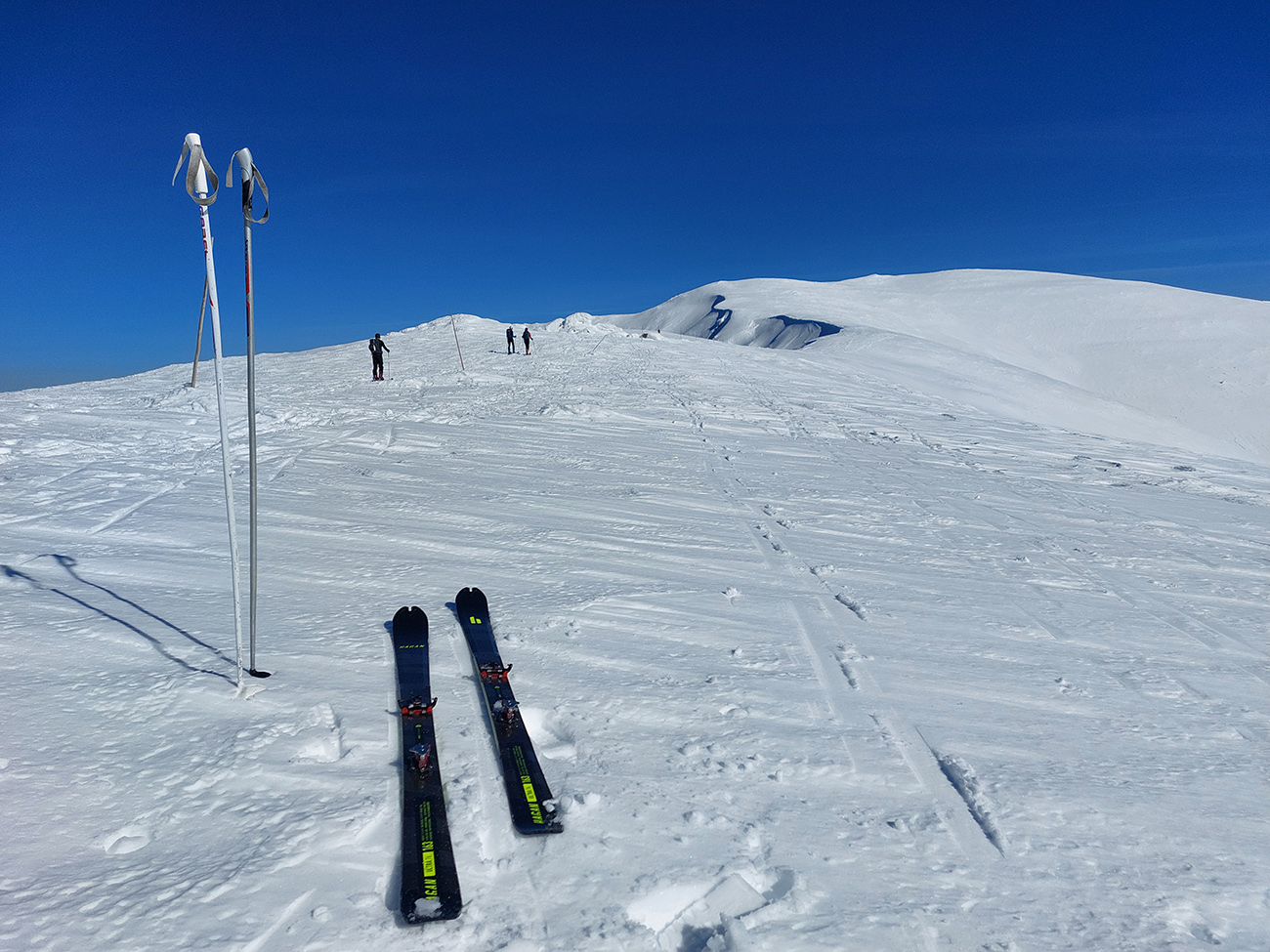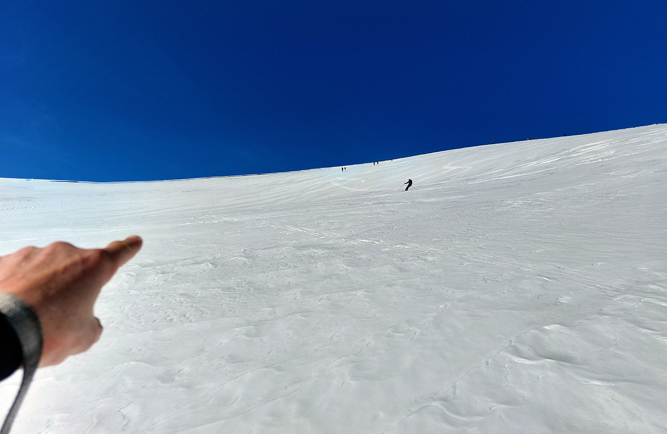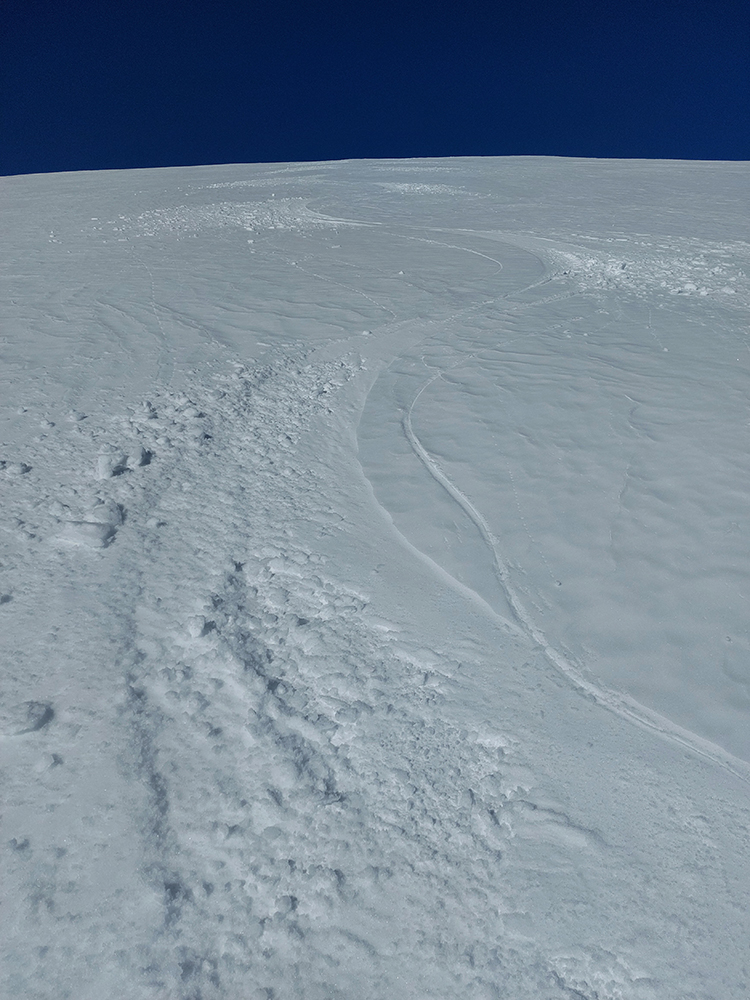 Ako sa to otvorilo, už sme si mohli vyberať, ktorou muldou na hrebeň. Vrhli sme sa najviac doľava, čiže do najširšej, najviac nasvietenej – aj keď len vo vrchnej časti. Čo najbližšie k Ďurkovej, aj keď reálne to najbližšie samozrejme nebolo. Ale nižšie v tieňoch zmrznutý sneh ako šmirgeľ, fasa držal, dalo sa aj v strmom pekne direkt po spádnici. A mimo stopy aj lepšie, lebo tá bola niekde až na ľad vyleštená. Potom vyššie, v strmých cikcakoch na slnku už to bolo trošku povolené. Spätné výhľady samozrejme maestro grandiózo.