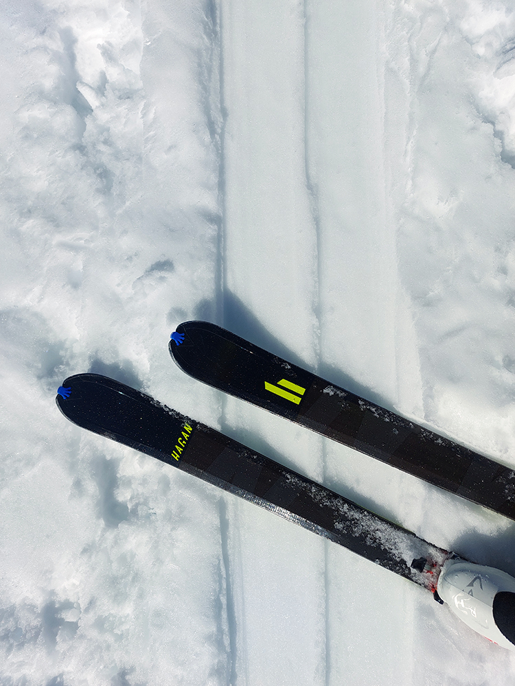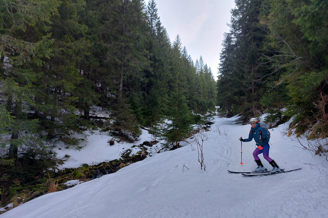Po bočnom rebre a v nižšom sklone sme sa potom už svižnejšie vykľučkovali pomedzi kosodrevinovo-snehové hrče na Ďurkovú a išlo sa prvý raz lyžovať – popri útulni dole, že kam až snehy pustia. Pustili dákych 200 výškových: hore parádna lyžba na čerstvo odmäknutej tenkej vrstvičke, smerom dole stále hlbšie prebáranie do čoraz prehnitejšej riediny.