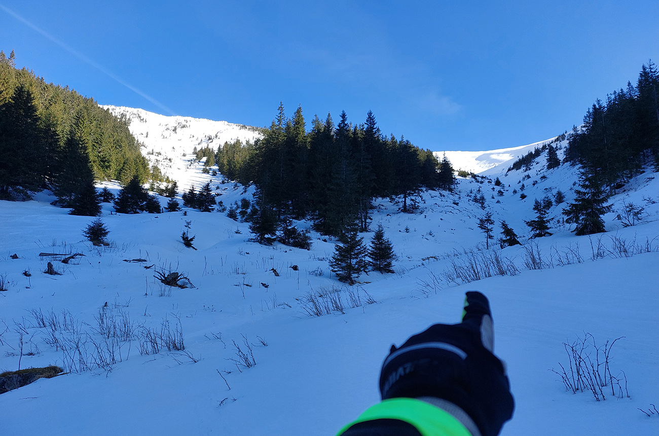 Prvé slabšie kusy už predtým emigrovali do útulne, teraz ďalšie dva, tak sme cestou dohodli časovo približnučké stretko na hrebeni a my čo ešte nabudení, davaj do severu. Pekne popri rázcestníku na hrebeni, že cez prevej dropneme backflipom priamo do tej muldy, z ktorej nedávno lavínka padla. Dole na dne ju vidieť, poriadne hrčovisko. Prevej ale slabý, tak sme nakoniec točili oblúky o jednu muldu na východ. Tam to bolo síce už pevnejšie a suchšie pod lyžami, ale dobré len na vrchu. Nižšie sneh veľmi nekonzistentný svojimi vlastnosťami, ktoré sa menili doslova v každom oblúku (vlhko, sucho, dosky, vankúše, mäkko, tvrdo...) a dosť nepríjemne to ťahalo za lyže.
