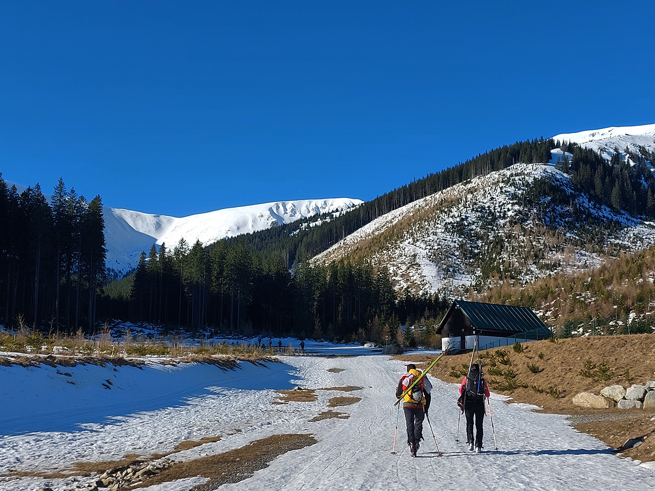 Najprv ale peši po prašnej ceste popri zasnežovacích nádržiach, tam sa už dalo pri smerovníku „Tri vody“ skočiť do lyží. Lepšie by ale boli korčule, niekde je tam aj seriózny, priesvitný ľad. V lese tiež fajne ľadovo, ruky dostali zabrať, aj pár malých obchádzočiek a „ľadovcových trhlín“ sa vyskytlo, na odbočku do traverzu potom pekne s lyžami v rukách po exkluzívnom a najmä strmom ľade.