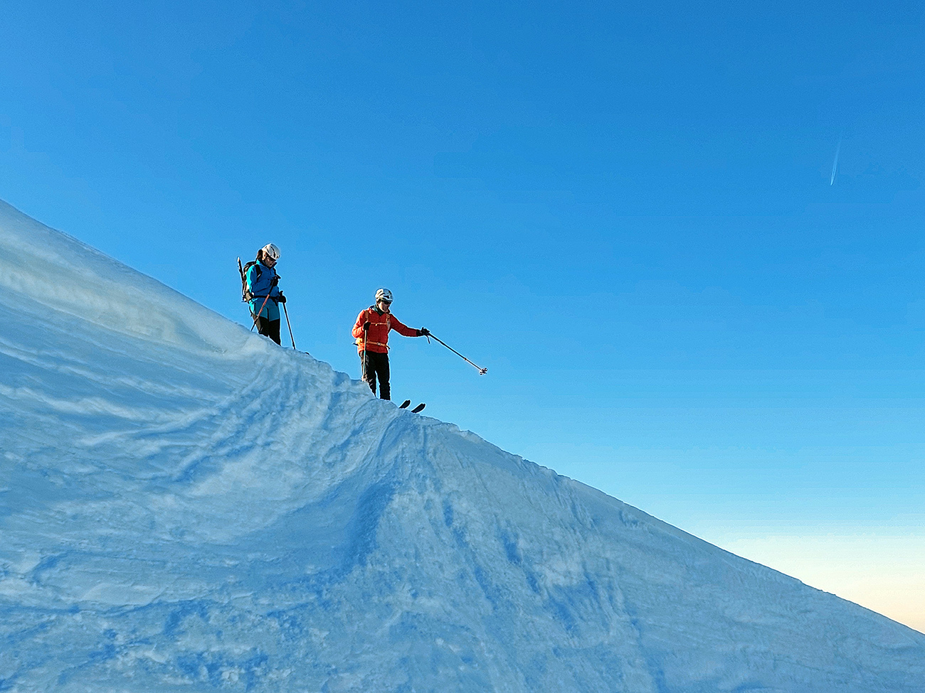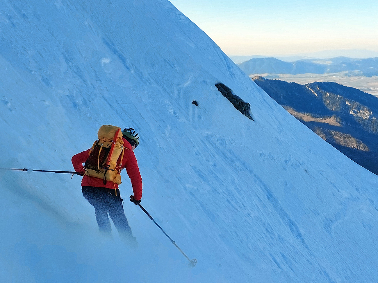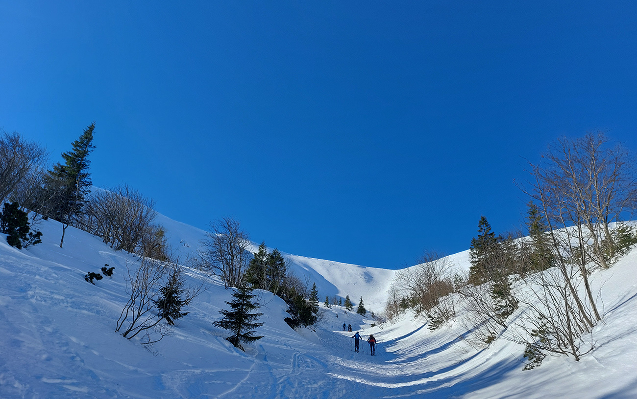 Výšľapy boli aj celkom výživné v tom teple, tak teda že mizneme do tieňov a domov. Takže sme sa prepotácali po hrebeni na Dereše a takmer z ich vrcholu sme to rubli kúsok dole po severnom rebre medzi východným a stredným kotlom – aby sme zatočili doprava, do hlbokej modrej polotmy vari hneď druhého žľabu.