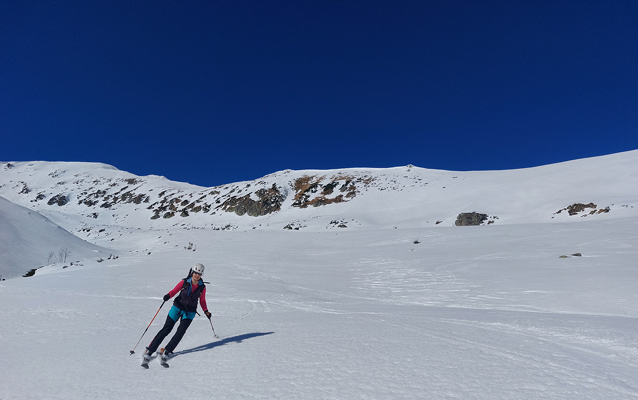Ozaj dobré podmienky – tvrdý, državý sneh, bez ľadových platní, aj keď už tade hafo ľudí prešlo. V strede viac vyšmýkaný podklad, po okrajoch viac čerstvého a dole nazosúvaná múka z vyšších polôh. V nej sa najlepšie točili oblúky.